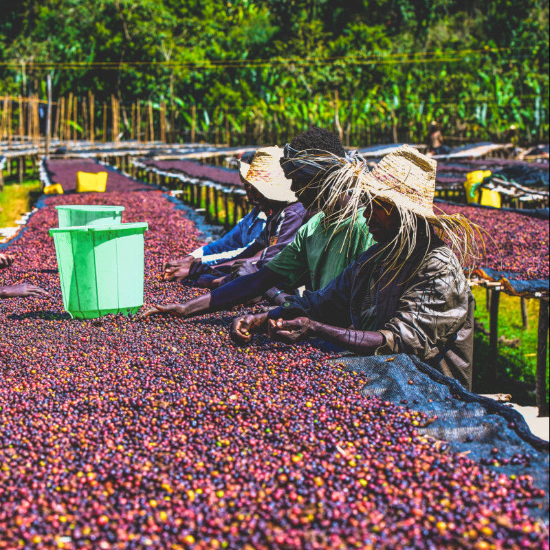Dieser Kaffee stammt aus der Region Sidama in Äthiopien und ist ein sogenannter Community Lot. Die handgepflückten, reifen Kirschen von verschiedenen Kleinproduzenten werden sorgfältig selektiert und gemeinsam verarbeitet, um ein konstant hochwertiges und ausdrucksstarkes Geschmacksprofil zu erzielen. Nach der Ernte werden die Kirschen gefloated, um Defekte zu entfernen, und anschließend 14–18 Tage auf afrikanischen Hochbetten getrocknet.