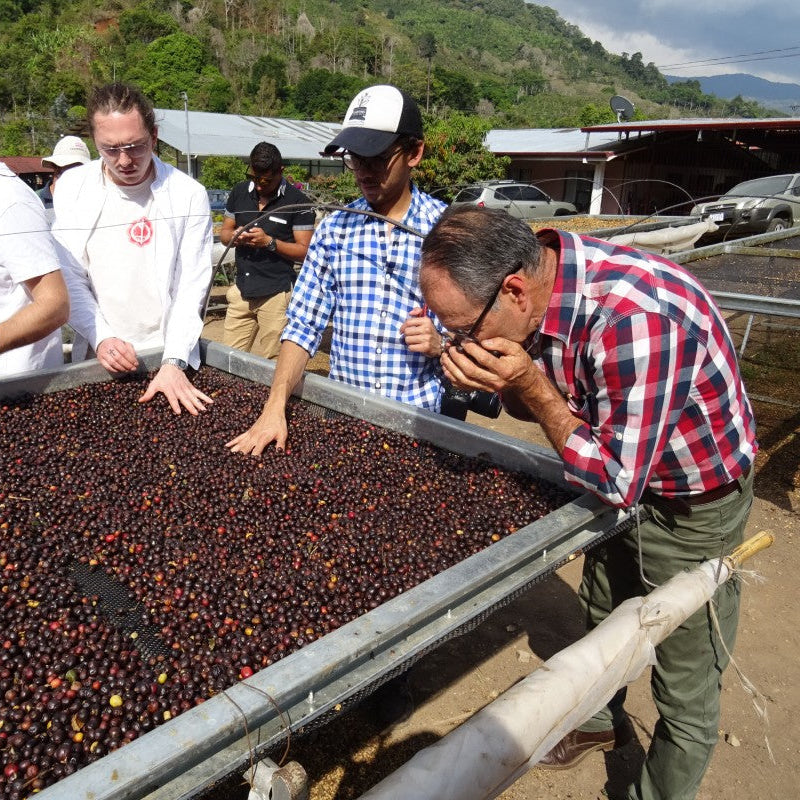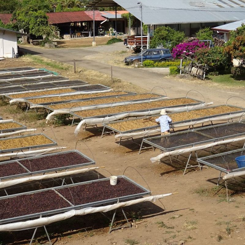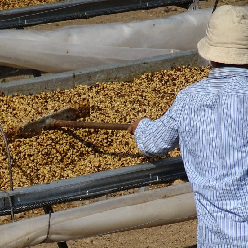 Alle Kirschen werden per Hand selektiert und anschließend auf Raised Beds getrocknet. Die finale Feuchtigkeitsreduktion erfolgt in mechanischen Dryern mit kontrollierter Temperatur, um ein maximal sauberes, reproduzierbares Profil zu erreichen.